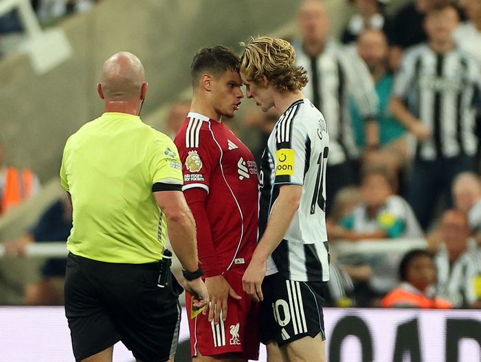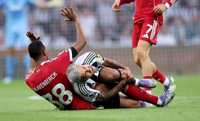 Litt temperatur ute på matta. Joelinton med en høy fot som treffer Gakpo i hodet. Slipper kort.