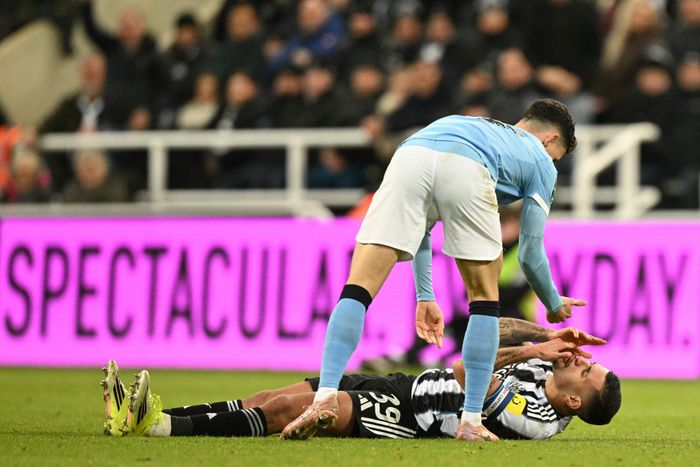 Gordon går ned i duell med Haaland. Newcastle får frispark.