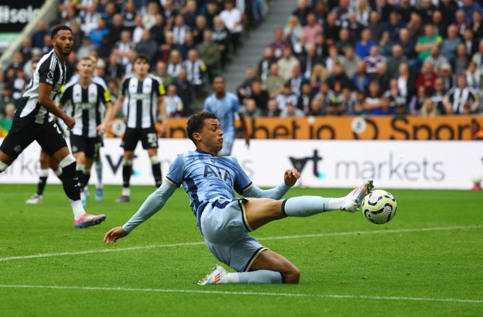 Tottenham Hotspur FC avanserer forover i Newcastle upon Tyne. Brennan Johnson avslutter, men treffer ikke mål.