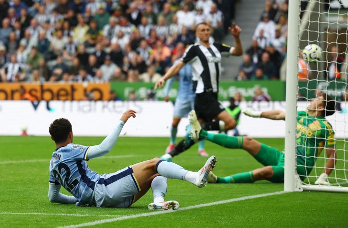 Lloyd Kelly (Newcastle United FC) header mot mål, men ballen går utenfor.