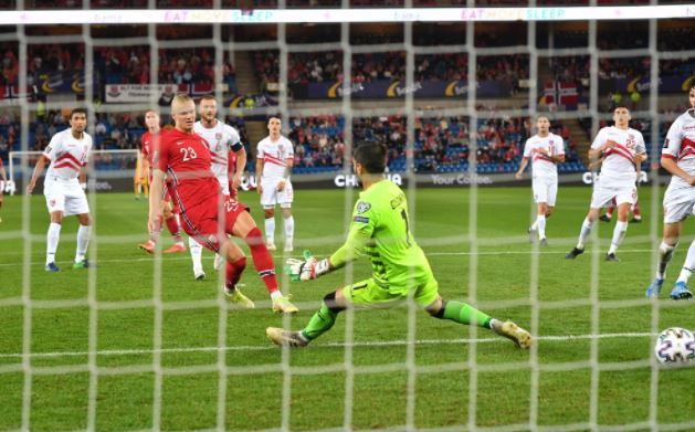 Gibraltar-keeperen med et svakt utspill, men er heldig når ballen havner hos en medspiller. Dette er ikke mannen som sto så godt mot Norge i den første kampen. Han er skadet, og reservekeeper Kyle Goldwin har fått jobben i kbeld.