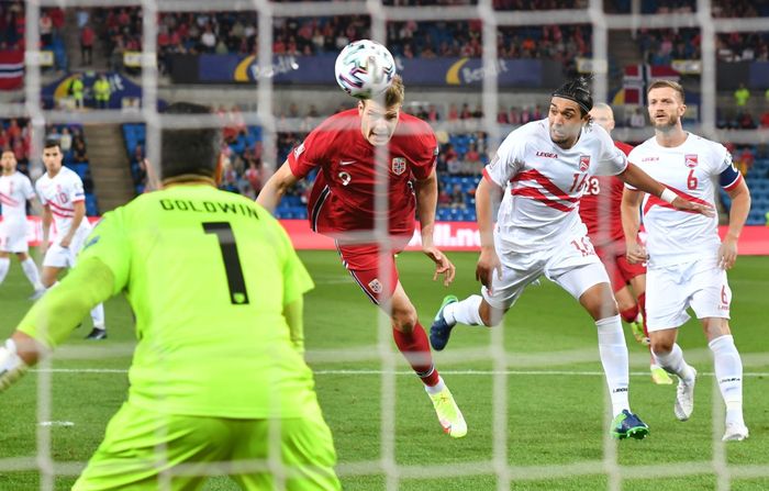Gibraltar får frispark på venstrekanten. Løftes inn i feltet, men der er Haaland og header unna.