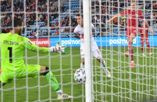 STRAFFE TIL NORGE! Det dømmes det, for hands. Men skal sjekkes av VAR. Wiseman er borti den med hånda.