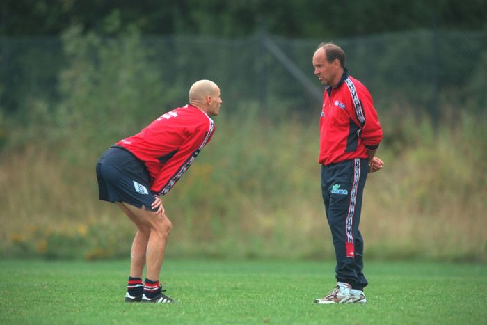 Med seier mot Israel i kveld, vil Ståle Solbakken tangere rekorden for antall seirer på rad på A-landslaget. Nils Johan Semb ledet Norge til ni seire i 1999, Solbakken står altså nå med åtte strake. På bildet ser dere Semb og Solbakken sammen under en landslagssamling i september 1999. Foto: Bjørn S. Delebekk / VG.