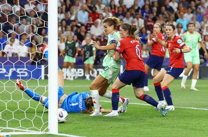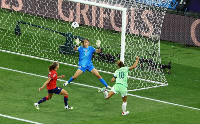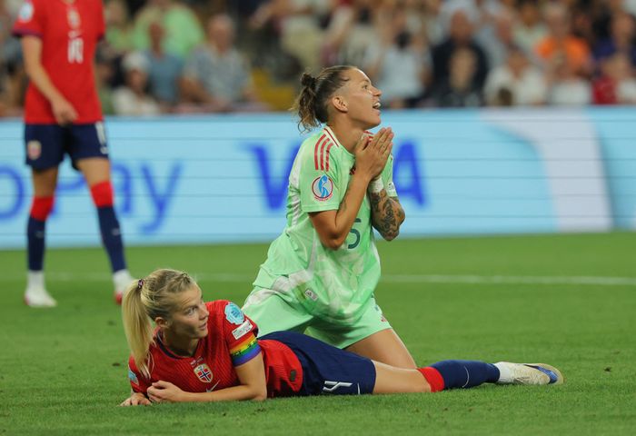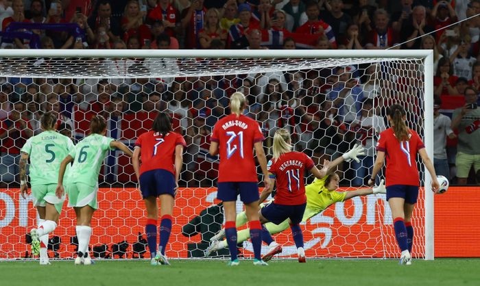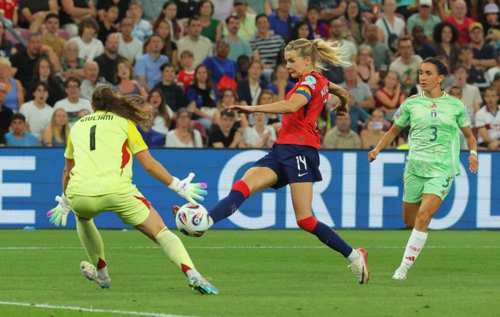 Hun bommer på mål! Giulieni går rett, men skuddet går uansett utenfor hennes venstre stolpe. Den er blytung for Norge og Hegerberg.