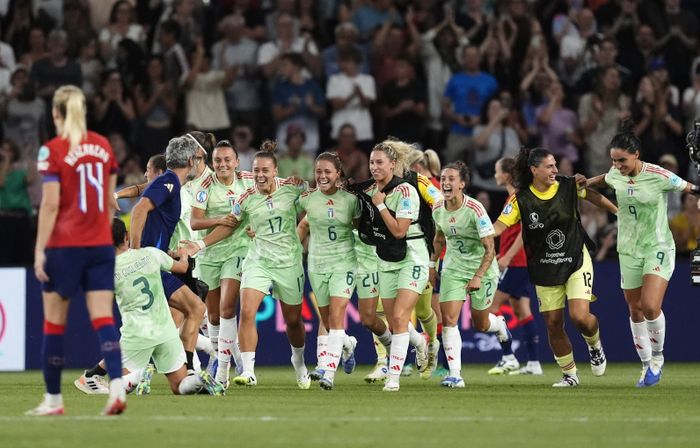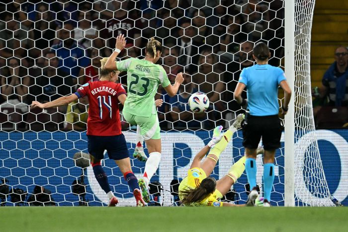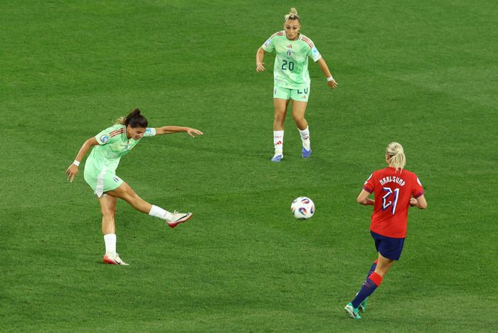 Nei, nei, nei, så scorer Italia. Og igjen er det Girelli som er sist på ballen. Et strøken innlegg fra Cantore finner spyspissen på bakerste stolpe bak ryggen til Reiten. Headingen går i tverrliggeren og inn, utagbart for Fiskerstrand.