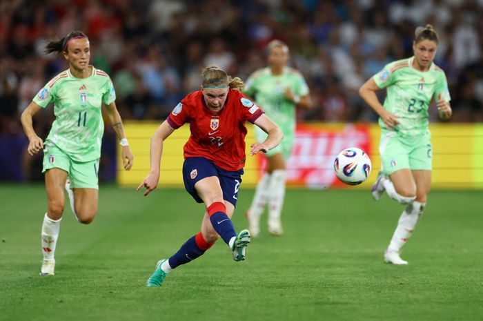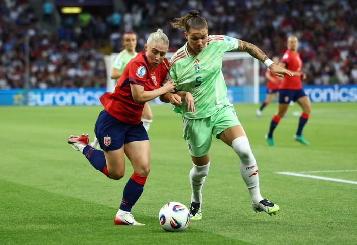 Hegerberg sendes på løpetur bak Italias forsvar. Linari leser den og kommer seg akkurat foran før Hegerberg dytter italieneren og lager frispark.