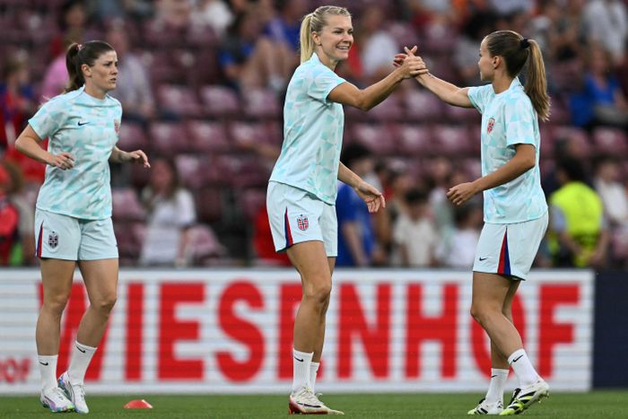 Maren Mjelde, Ada Hegerberg, Guro Reiten og resten av laget er i gang med oppvarmingen!