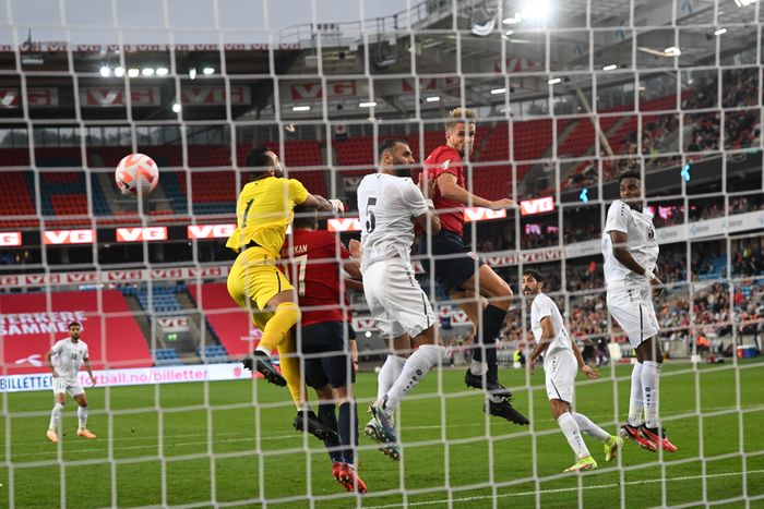 Ajer stanger inn 2-0! Aursnes hjørnespark er presist, og i feltet flyr Ajer skyhøyt. Langt høyere enn alle andre. Da er mye gjort. Midtstopperen header inn sitt første landslagsmål! Foto: Bjørn S. Delebekk.