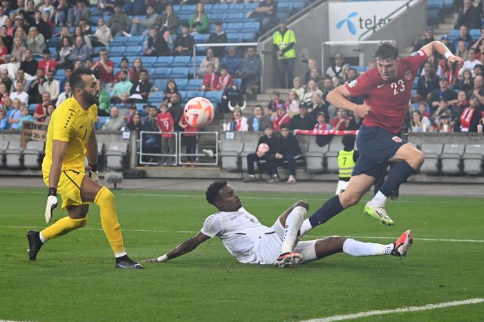 Herlig scoring av Norge! Sahraoui sier fullstendig farvel til Nasib, før han spiller vegg med Finne. Så legger Sahraoui perfekt inn til Vetlesen foran mål, og også han får sitt første landslagsmål! 6-0! Foto: Bjørn S. Delebekk, VG.