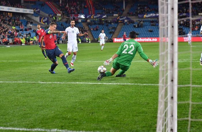 Kypros første sjanse i kampen! Det er Papoluis som skyter rett på Jarstein fra ti meter etter at Sotritiro holder unna Ajer.