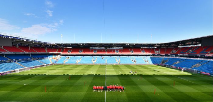 Avspark er tatt på Ullevaal. Norge i rødt og blått. Kypros i hvitt fra topp til tå.