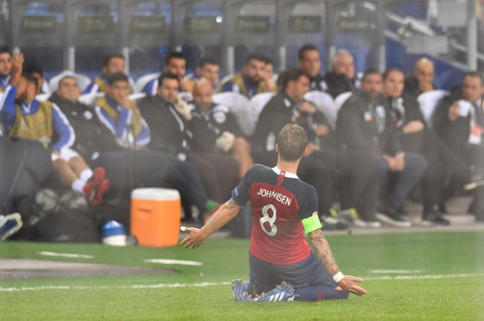 Kapteinen Stefan Johansen scorer alene med keeper! Mange lurte på om han skulle spille, men det gjør han. Og han feirer med å holde hånden til øret. Et klart budskap. Avslutningen alene med keeper går via foten og opp i nettmaskene. Norge scorer på sin første sjanse!