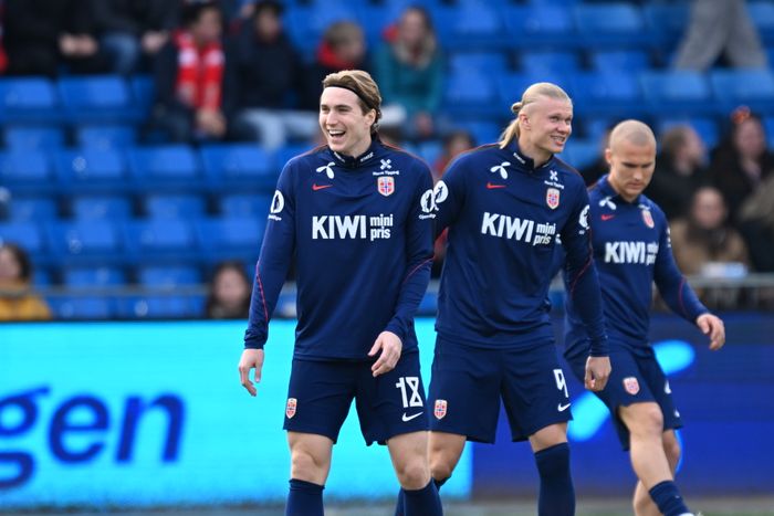 Det varmes opp på Ullevaal. Her er ERLING BRAUT HAALAND, Kristian Thorstvedt og Leo Skiri Østigård. Foto: BJØRN S. DELEBEKK