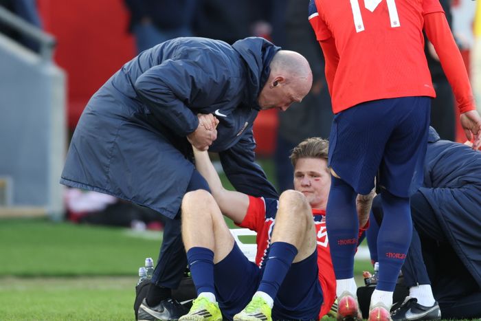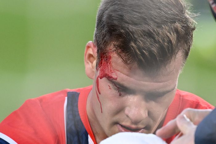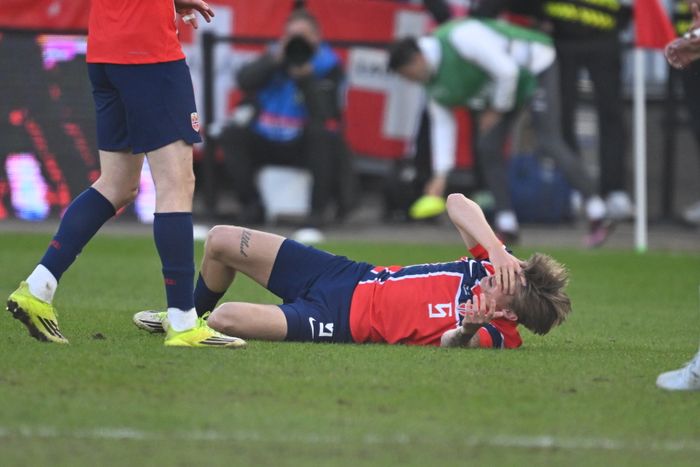 Ingen rapport ennå om hvordan det går med Alexander Sørloth etter at han smalt inn i Widmer i forsøket på et hodemål. Det var vel Norges største sjanse så langt i kampen. Sørloth får tilsyn i garderoben av sitt blødende hode.