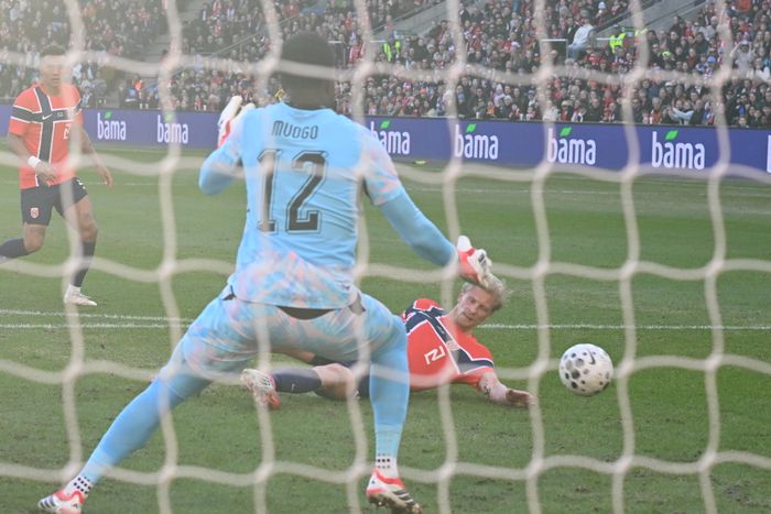 Ballen til Sørøoth, han klinker til med venstrefoten fra 22-23 meter. Keeper holder ballen. Haaland sto klar om det skulle blitt en retur.
