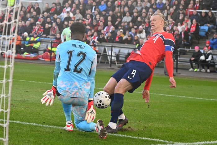 Haaland frempå, tar nesten ballen Amenda spiller mot egen keeper. Norge får corner. Foto: BJØRN S. DELEBEKK