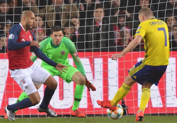 Fint svensk angrep, som ender hos Quaison. Han prøver seg med en avslutning, men treffer dårlig og Jarstein redder uten problemer.