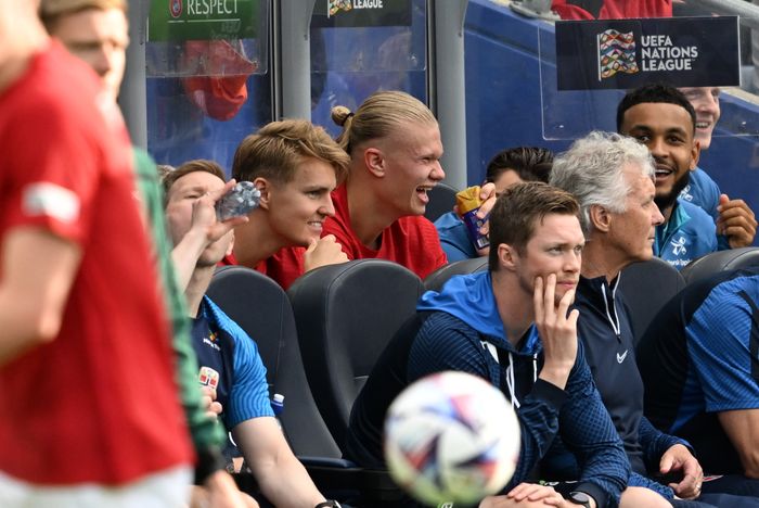 Haaland og Ødegaard gliser godt på Norges benk etter at de ble byttet ut. Foto: Bjørn S. Delebekk.