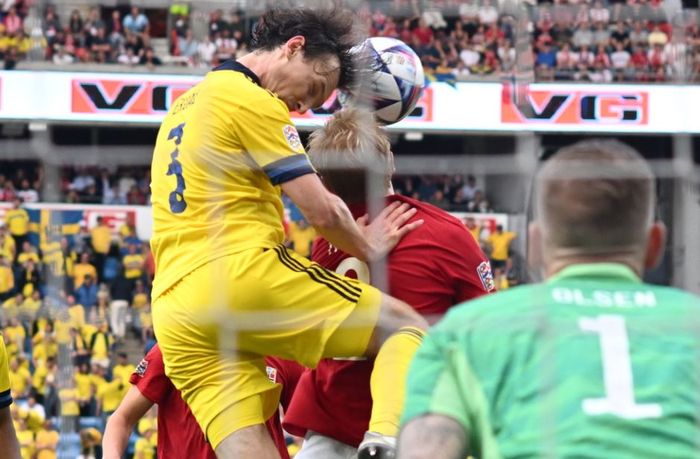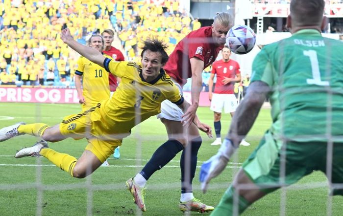 Her header Haaland inn 1-0! Verken Hjalmar Ekdal eller Robin Olsen kan stoppe den norske stjernen. Foto: Bjørn S. Delebekk.