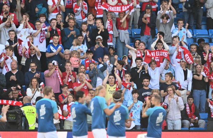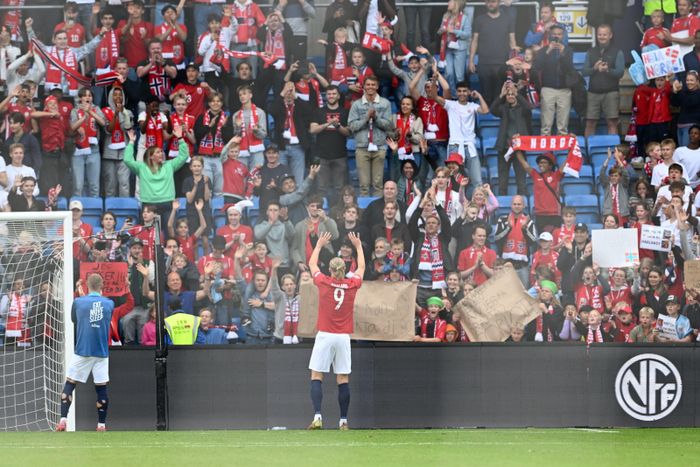 Erling Braut Haaland og de norske supporterne er blitt gode venner. Foto: Bjørn S. Delebekk.