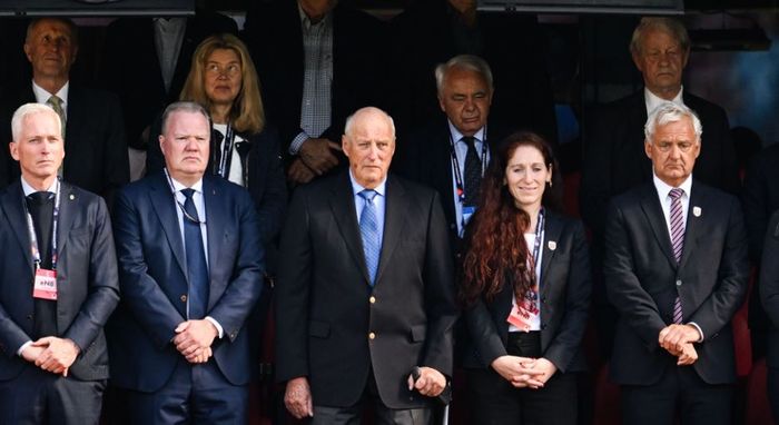 Kongen koser seg tydeligvis. Det er verre med Sveriges fotballpresident (t.v. for Kongen). Foto: Bjørn S. Delebekk.