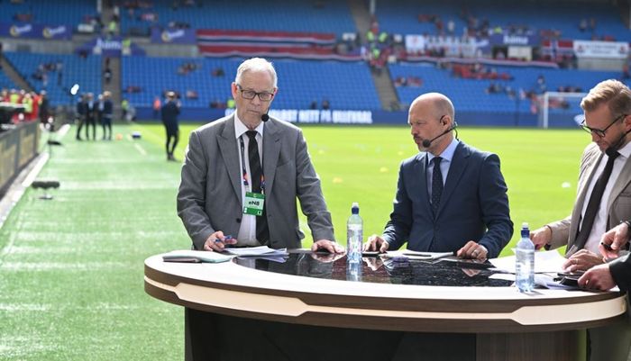 Lars Lagerbäck er tilbake på sin gamle arbeidsplass Ullevaal. Han og Roger Ljung er i TV6s studio før kampen på Ullevaal. Foto: Bjørn S. Delebekk.