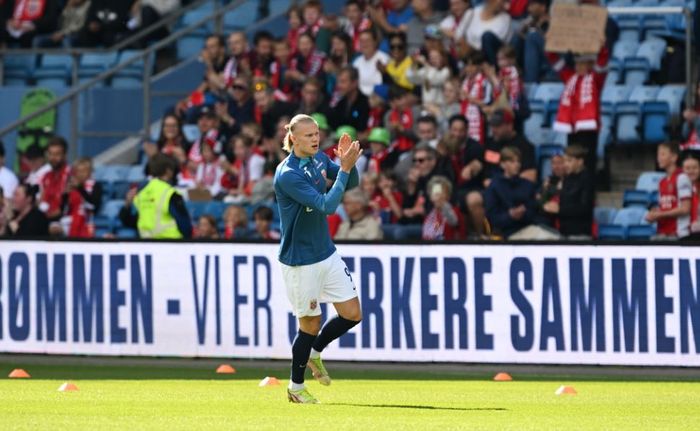 Erling Braut Haaland klapper til publikum før kampen mot Sverige på et fullsatt Ullevaal. Foto: Bjørn S. Delebekk.