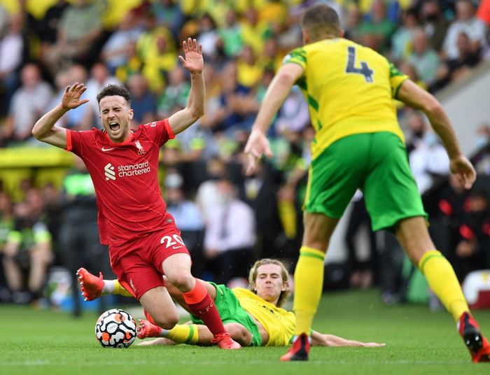 SÅ KOMMER DEN! Og det er Jota som åpner Liverpools målkonto for sesongen! Alexander-Arnold finner Salah som får en liten touch på ballen som gir Jota fri bane. Portugiseren banker Liverpool i føringen! Foto: Reuters.