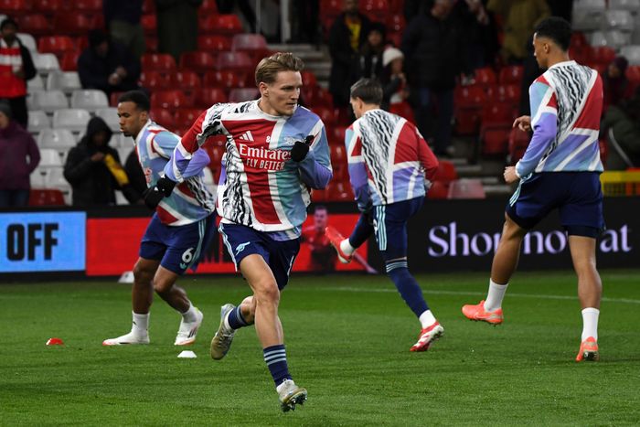 Arsenal starter slik (4-3-3): Raya - Timber, Saliba, Gabriel, Calafiori - Jorginho, Rice, Ødegaard - Nwaneri, Merino, Trossard