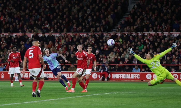 Så er Wood nesten alene med Raya, men Saliba gjør en kjempejobb i det han stopper Forest sin toppscorer. Ypper seg nå, hjemmelaget!