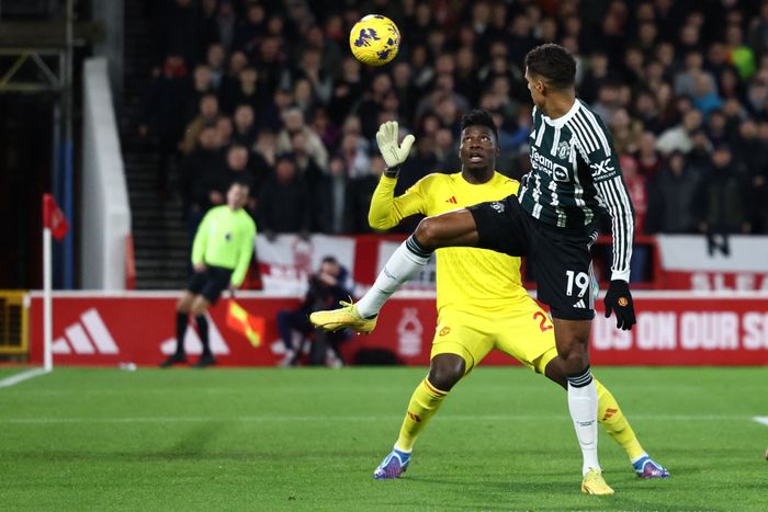 Fernandes slår inn mot Garnacho, men vingen når ikke frem foran mål. 5-meter til Forest.