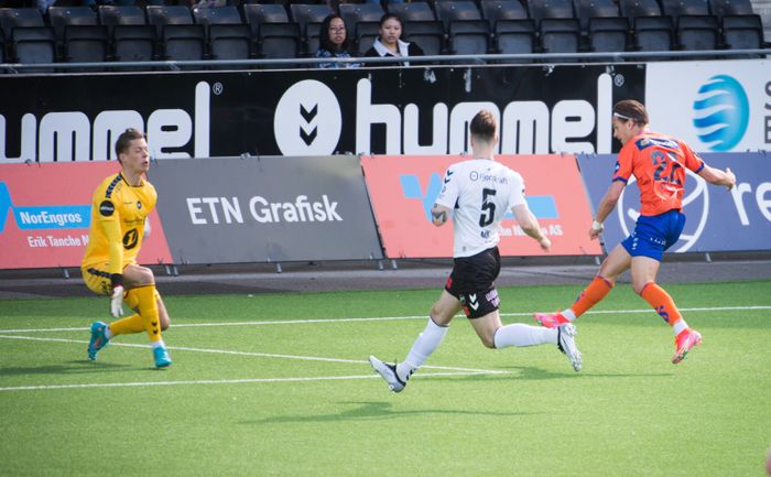 Kastrati prøver seg og lykkes nesten! Går noen meter med ballen, før han forsøker å curle den inn fra cirka 20 meter. Skuddet seiler én meter utenfor stolpen til Grytebust. Godt forsøk av Kastrati!