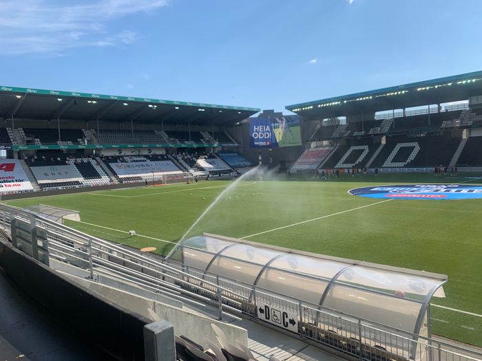 Rundt 50 Odd-supportere har funnet seg hver sin plass – med god avstand – i skyggen på den ene kortsiden av Skagerak arena. Det er hett på Skagerak denne tirsdag med opp mot 30 varmegrader.