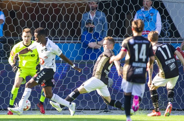 Eric Kitolano legger inn fra høyre, og Moses header godt - Rossbach varter opp med en fin redning.