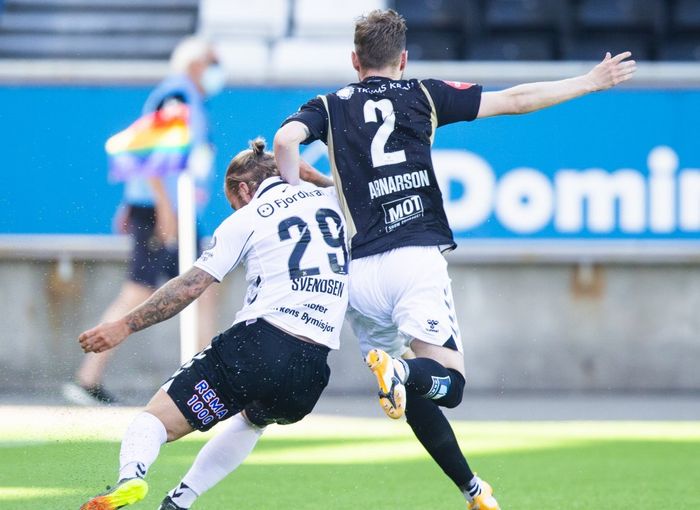Sander Svendsen har fått seg en skikkelig smell i bakhodet. Ligger nede etter å ha blokkert et innlegg fra Arnarson med bakhodet. Han rusler til slutt av banen og holder seg til hodet.
