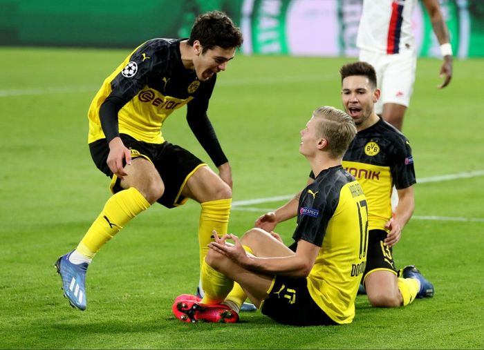 Det første oppgjøret, på Signal Iduna Park i Dortmund, endte med 2-1-seier til de gule og sorte, takket være to scoringer fra Erling Braut Haaland. Neymar scoret det viktige bortemålet for PSG. Foto: Reuters.