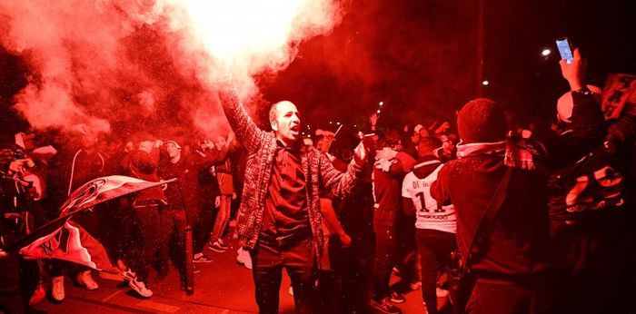 Det er kanskje tomme tribuner inne på Parc Des Princes, men utenfor stadion er det full fest. Foto: AFP.