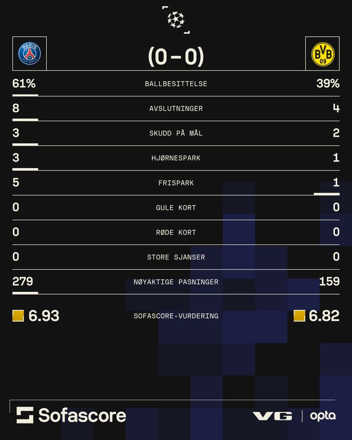 Veldig jevnt. PSG mest ball. Ingen veldig store sjanser.