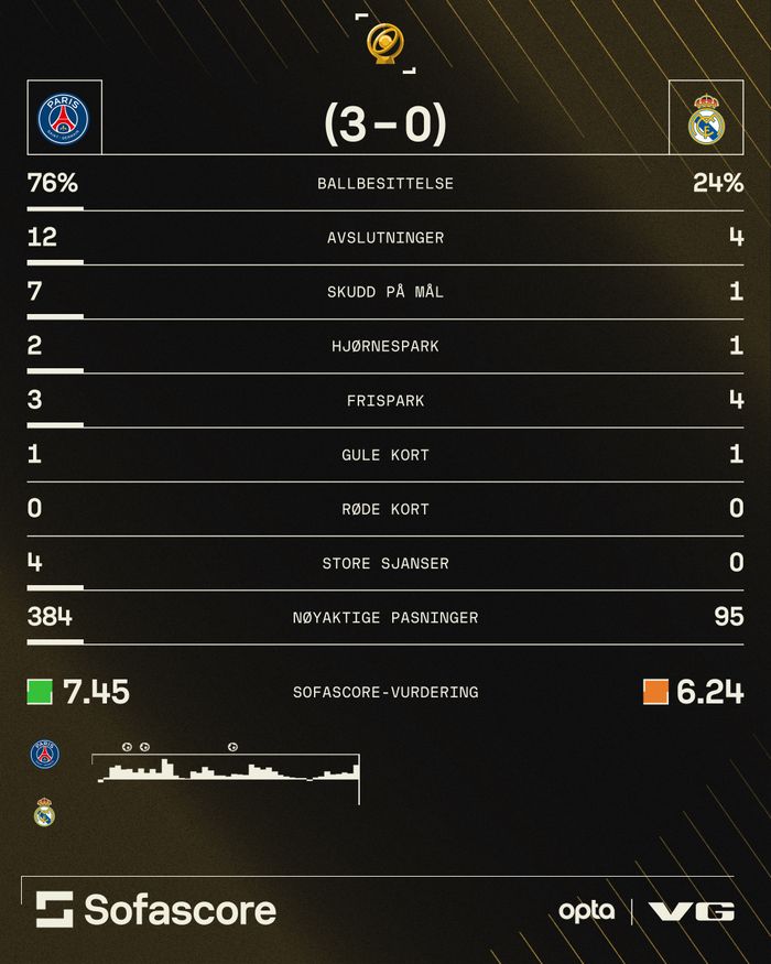 Ingen overtid her og PSG er klar for finale i klubb-VM. Real Madrid ble feid av banen, og det sto 3-0 etter kun 23 minutter etter to mål fra Fabian Ruiz og et fra Ousmane Dembele. To av målene kom etter enorme tabber i Real Madrid-forsvaret, og derifra ble det vanskelig for dem å komme seg inn i kampen igjen. Mot slutten punkterte Goncalo Ramos et allerede flatt dekk av en kamp når han banket inn 4-0. Champions League-mesterne fortsetter sin eventyrlige sesong. På motsatt banehalvdel i finalen på søndag står Chelsea.