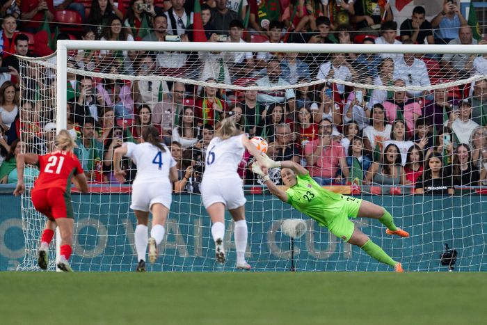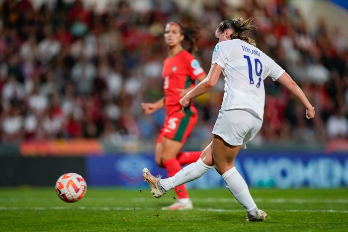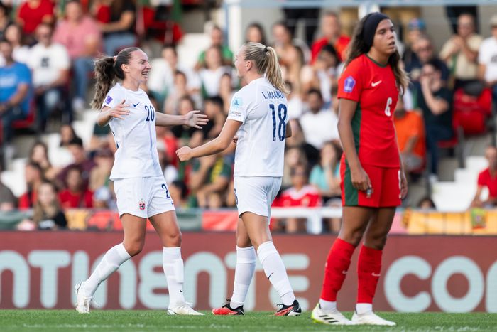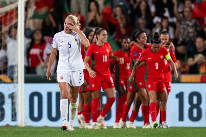 Guro Bergsvand fortviler, mens Portugal jubler etter 3-2-målet. Foto: Bildbyrån