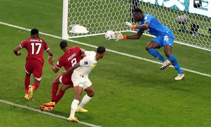 Barsham er våken når keeper-Mendy sender at utspill til Sarr. Der redder han Qatar fra en baklengs.