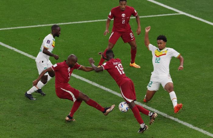 Kaos i Senegal-forsvaret, men de får til slutt avklart. Qatar-spillerne står i kø for å score og går i veien for hverandre. Foto: Reuters