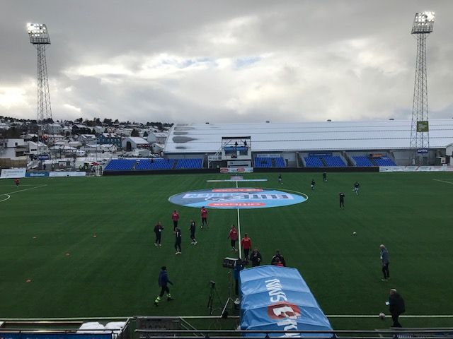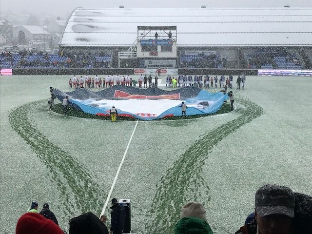 Avspark er sju minutter unna, og tykke og mange snøfiller laver ned fra oven. Kunstgressmatta er ikke hvit, men den er lys grønn. Det kan nok bli et spørsmål om denne kampen kan spilles/avsluttes...