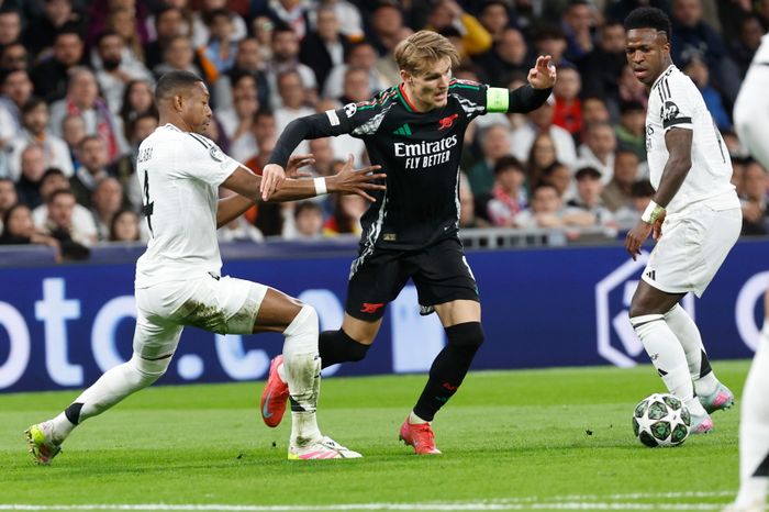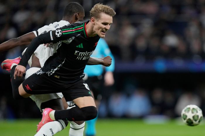 Ødegaard avslutter fra 14-15 meter. Arsenal-kapteinen prøver å plassere ballen ned i det lengste hjørnet, men bommer med en meter.