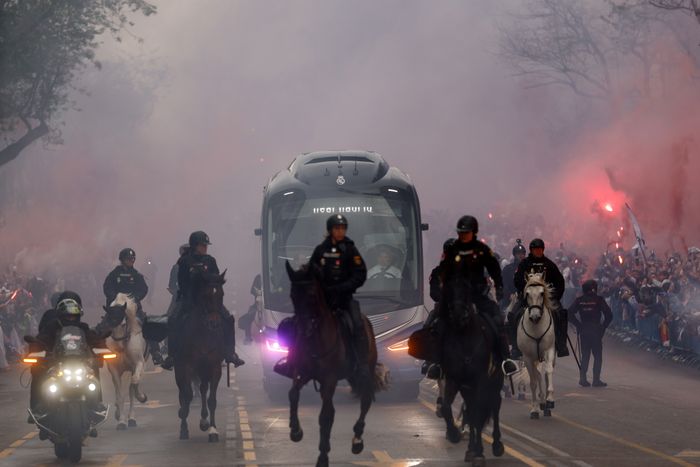 Teambussen til Real Madrid blir eskortert til stadion. Foto: EPA