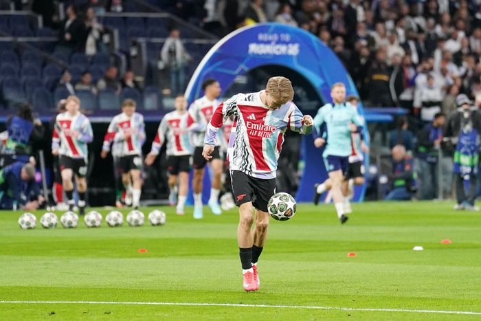 Martin Ødegaard varmer opp. Foto: PA Photos.