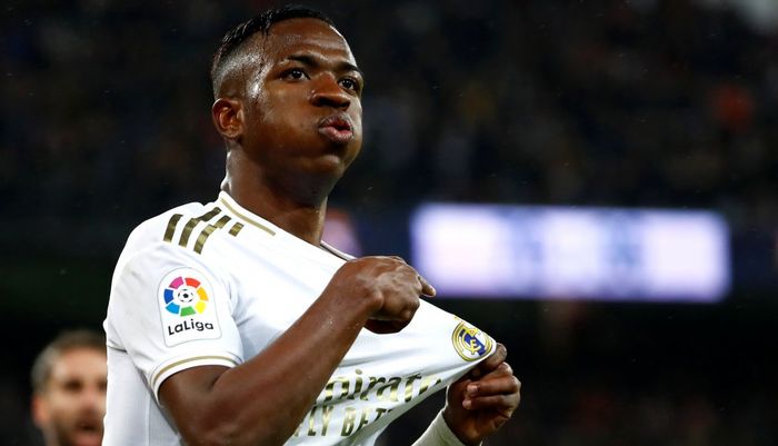 HAN SPILLER SOM EN SENIOR! Vinicius Jr. blir spilt fri av Kroos og fosser mot mål fra sin venstrekantposisjon. Denne gang bestemmer han seg for å skyte - og via Piqué går ballen i mål. 1-0! Foto: RETUERS