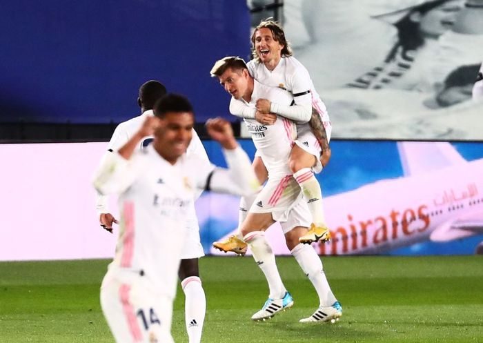 Kroos og Modric feirer 2-0-målet til tyskeren.
