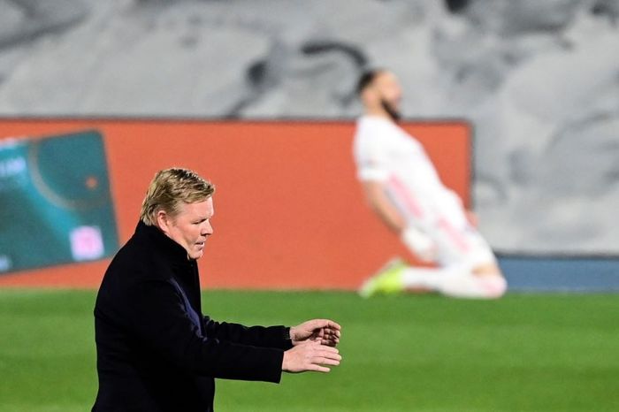 Barca-trener Ronald Koeman fortviler mens Benzema feirer sitt mål i bakgrunnen.